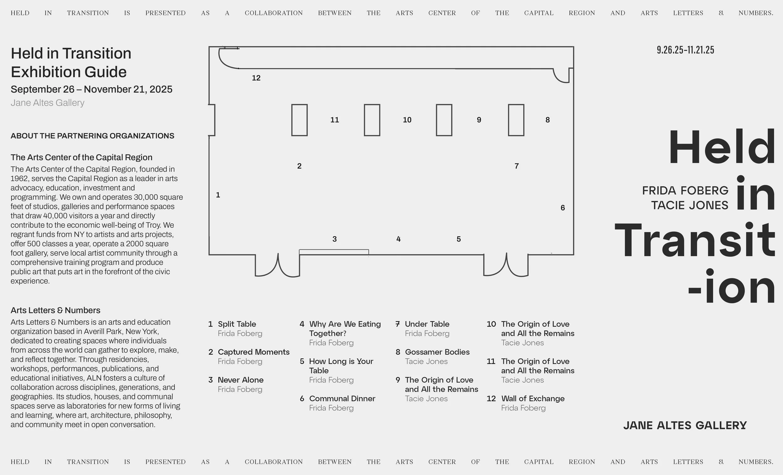 Held in Transition is an exhibition hosted by The Arts Center of the Capital Region and created in collaboration with Arts Letters & Numbers, featuring works by artists Frida Foberg and Tacie Jones exploring change, perception, and transformation.