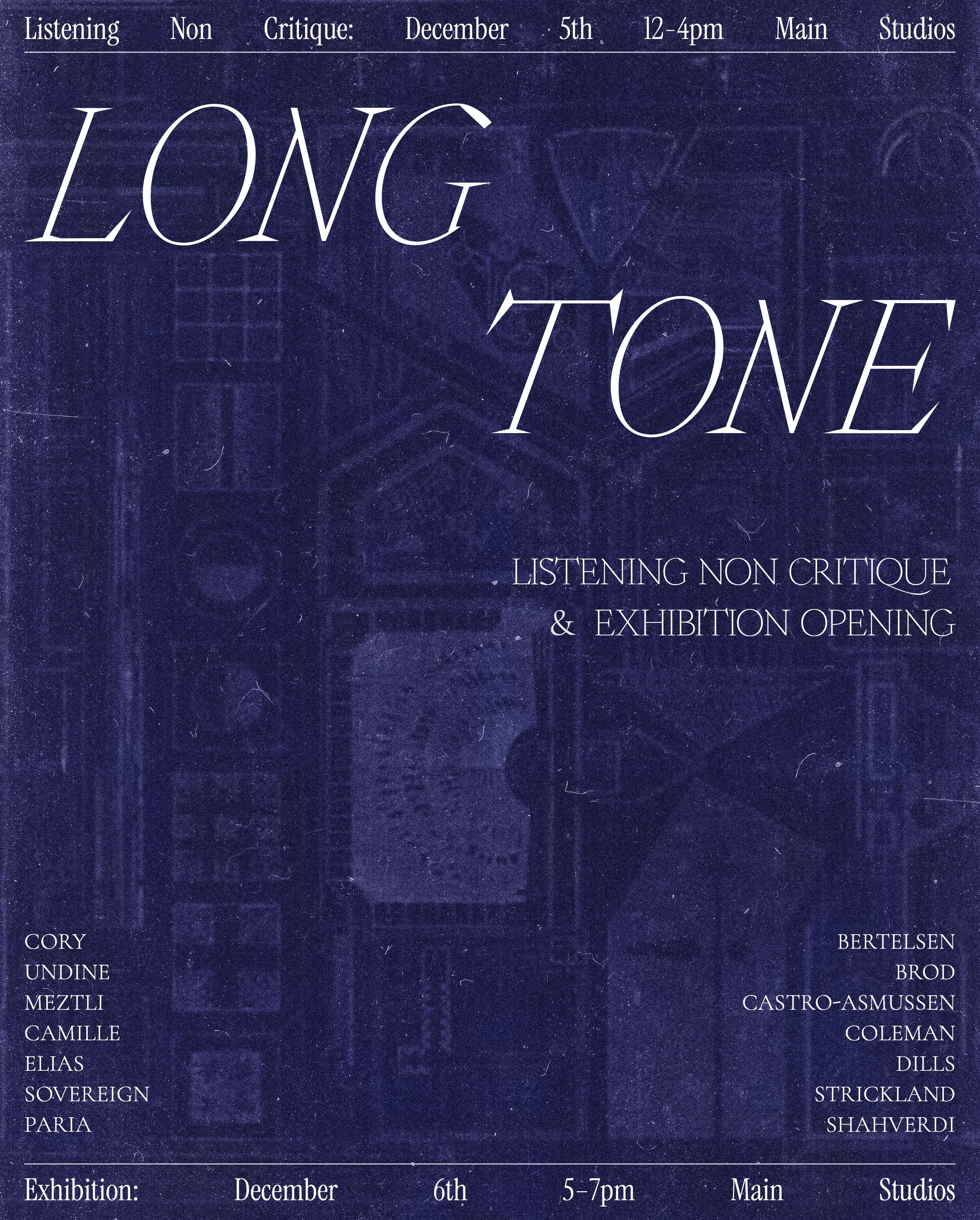 The close of the semester is marked by two culminating events: the Listening Non Critique on Friday, December 5, held in the Main Studios with two open sessions from 12 to 2 PM and 2 to 4 PM; and the Long Tone Exhibition Opening: Final Works from the Semester Studio on Saturday, December 6, also in the Main Studios, from 5 to 7 PM. Participating members of the Semester Studio include Cory Bertelsen, Undine Brod, Meztli Castro Asmussen, Camille Coleman, Elias Dills, Sovereign Strickland, and Paria Shahverdi, whose individual and collective inquiries have shaped this first edition of the Long Tone studio.
