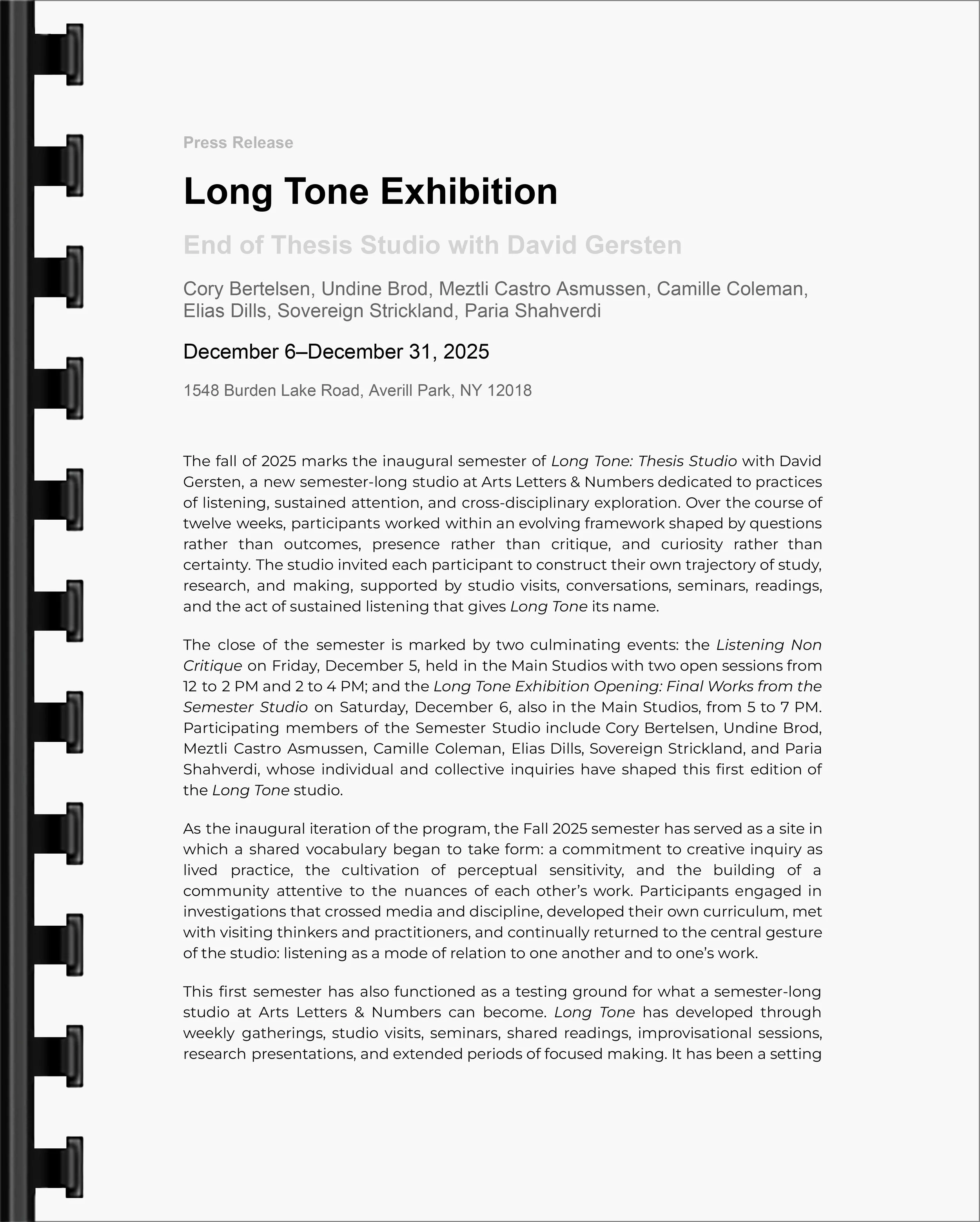 The fall of 2025 marks the inaugural semester of Long Tone: Thesis Studio with David Gersten, a new semester-long studio at Arts Letters & Numbers dedicated to practices of listening, sustained attention, and cross-disciplinary exploration. Over the course of twelve weeks, participants worked within an evolving framework shaped by questions rather than outcomes, presence rather than critique, and curiosity rather than certainty. The studio invited each participant to construct their own trajectory of study, research, and making, supported by studio visits, conversations, seminars, readings, and the act of sustained listening that gives Long Tone its name.