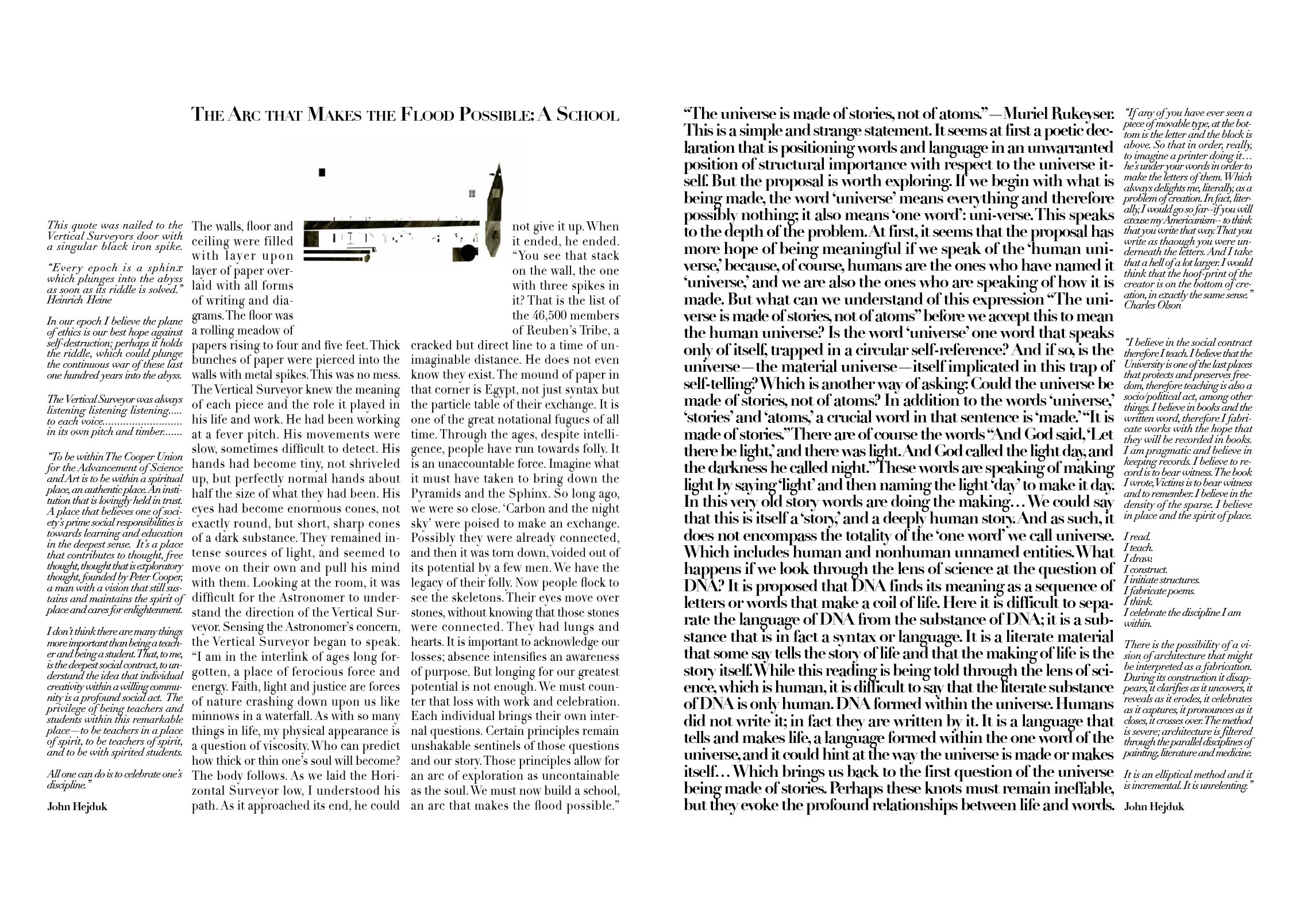 There is now an urgent need for exploratory works of ethics and imagination, and it is for all of us to find the questions, works, and movements of our time; to listen to unheard voices, to search for unknown linkages, to ask questions that have not yet been imagined, and to create transformations that embody our best hopes and aspirations. Long Tone: Thesis Studio with David Gersten is a space for exploratory, uncontainable, and independent works ignited by the poetic imagination: works that heighten and expand our spatio-material imaginations. It is a space of inquiry into the human condition and a place for creating the world anew.