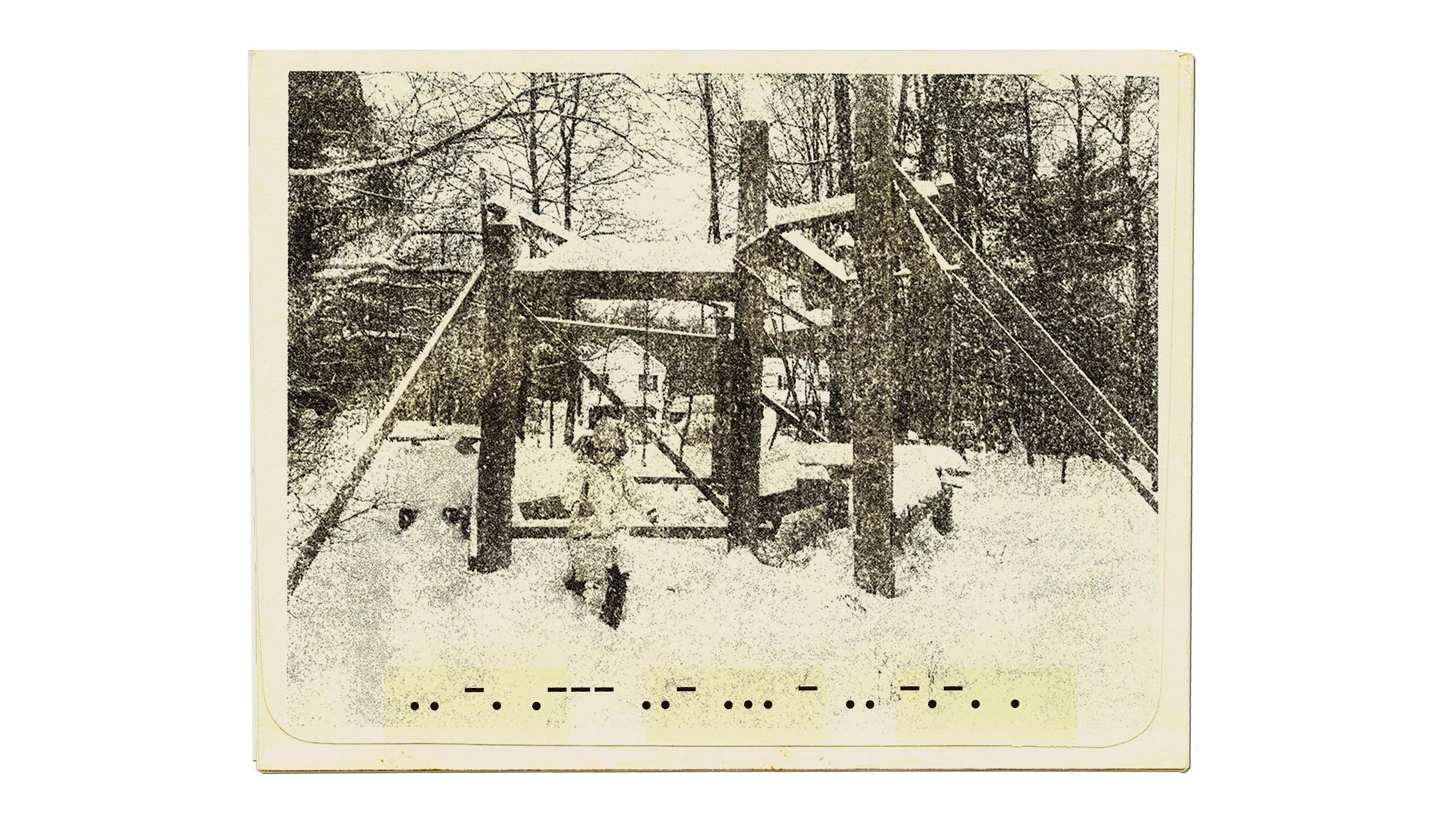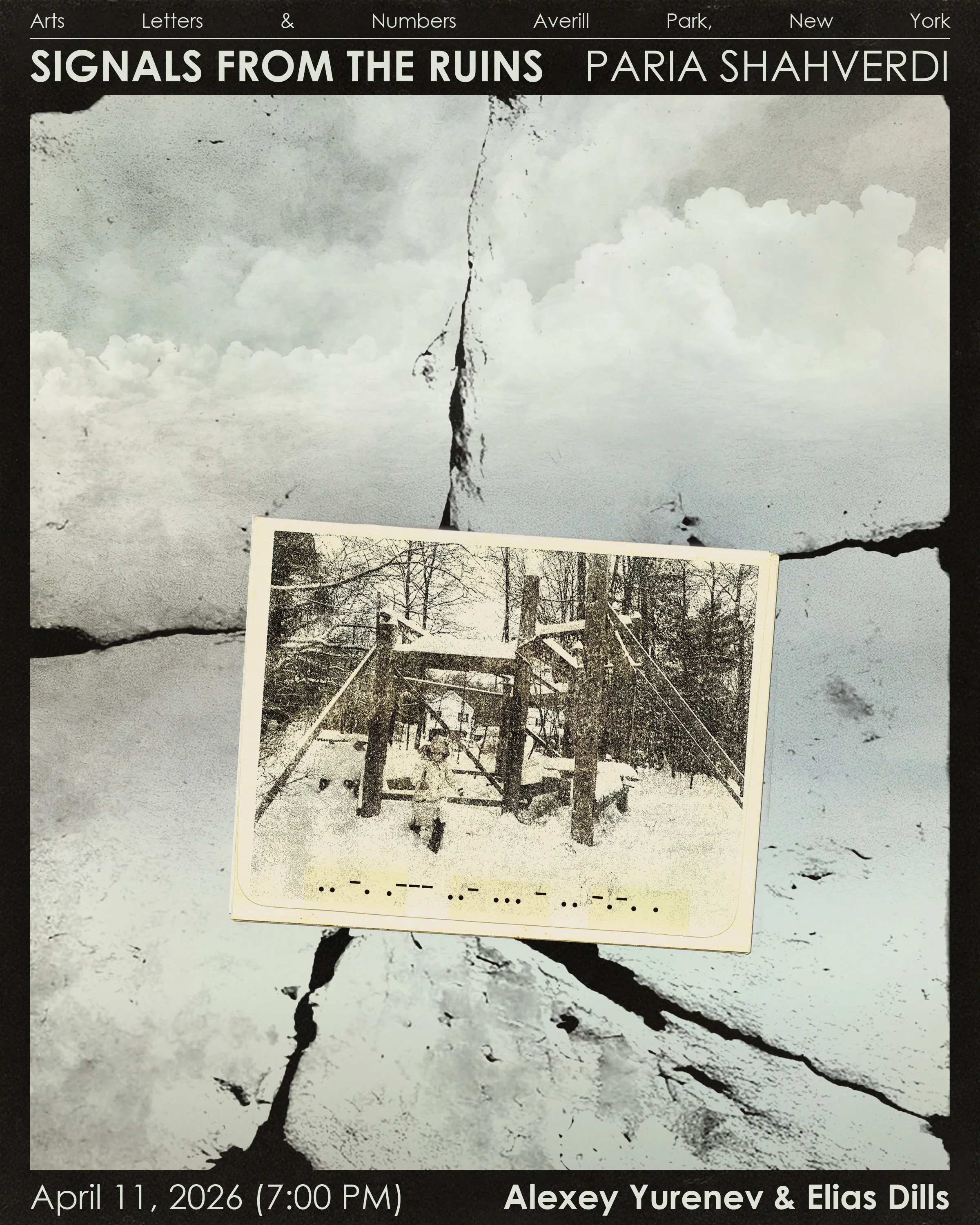 Signals from the Ruins is an installation conceived and created by Paria Shahverdi. The work emerges from a site on the Arts Letters & Numbers campus that resembles the remains of a ruined city. Shahverdi painted expressive human figures in white acrylic on approximately fifty sheets of plexiglass, one figure on each sheet. These translucent figures form two L shaped silhouette walls, appearing like fragile presences suspended within a landscape of memory and destruction.