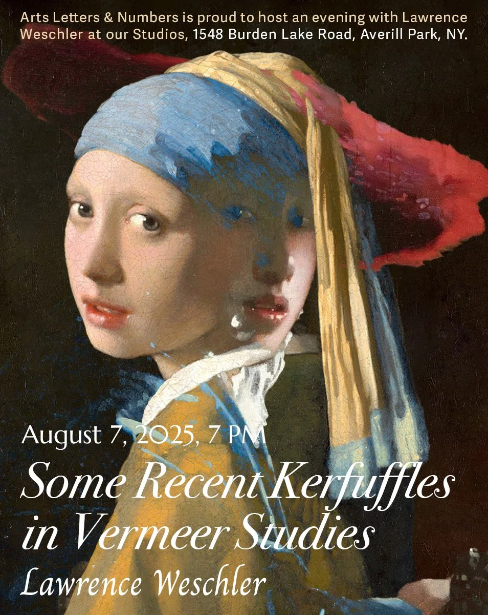 Lawrence Weschler presents “Some Recent Kerfuffles in Vermeer Studies,” starting with Penn and Jilette’s film Tim’s Vermeer from a few years back (with a denouement in Chris Marker’s La Jetée); then the Art Crime of the Century So Far (the so-called restauration of what was once one of Vermeer’s greatest and most biographically pivotal paintings, now pretty much destroyed—Dresden’s heartrending Girl Reading a Letter at an Open Window); then the Main Event: mounting evidence that Ben Binstock may well be right that the Girl with a Pearl Earring is not (per Tracy Chevalier) Vermeer’s mistress but rather his oldest child, his daughter Maria, who was also his assistant and ongoing painting partner, completely responsible for fully 8 of the 34 paintings currently attributed to her father—including several of the most beloved (such as the National Gallery’s Girl with a Red Hat, which is Maria’s self-portrait, and the Frick’s Mistress and Maid, currently at the center of their big grand reopening celebratory Three Vermeer Love Letters show).